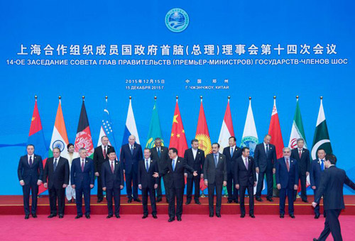 中国日报12月15日电(记者 李潇坤)15日上午,李克强总理在郑州国际会展中心与出席上海合作组织成员国政府首脑(总理)理事会第14次会议的成员国、观察员国领导人和国际组织负责人集体合影。(新华社 王晔 摄)