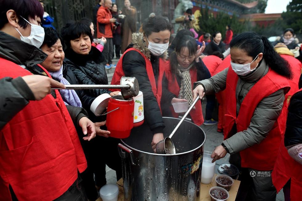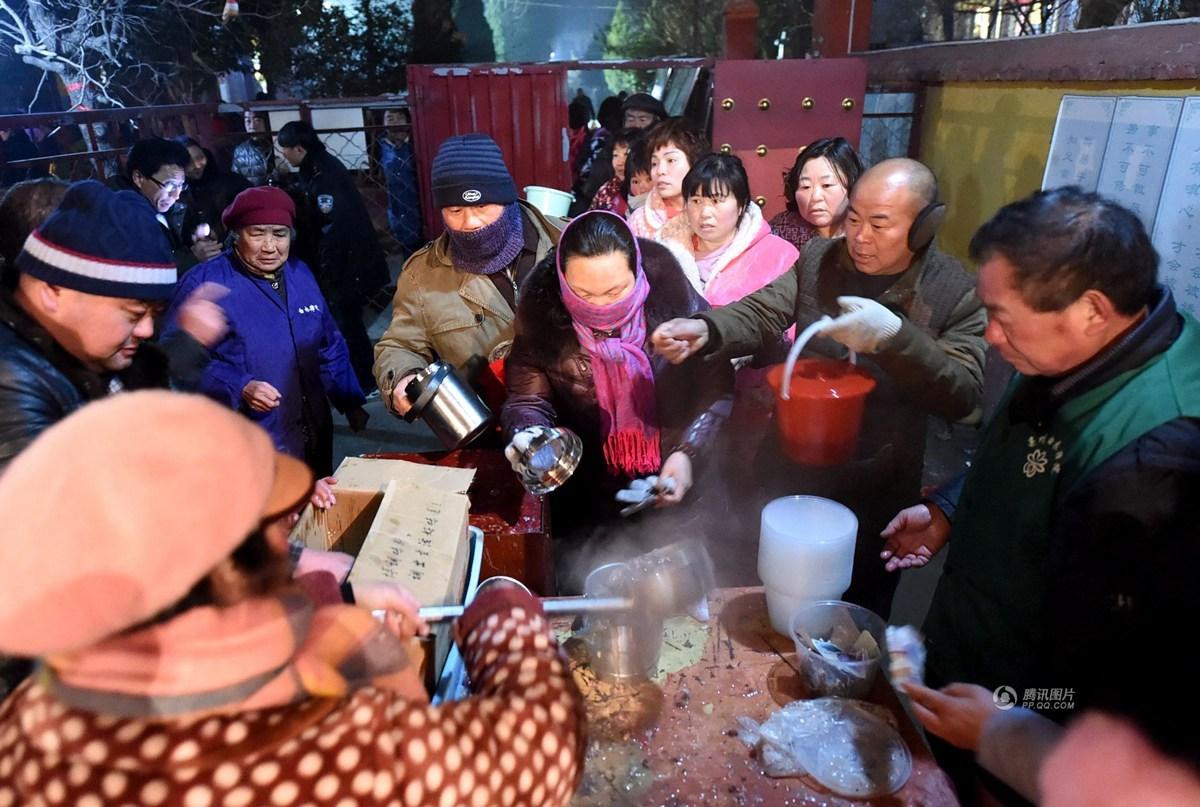 安徽省淮北市相山显通寺向市民免费发放一万余份腊八粥,为市民施粥送祝福,吸此众多市民前来排队品粥,盼望来年吉祥平安。万善朝/东方IC