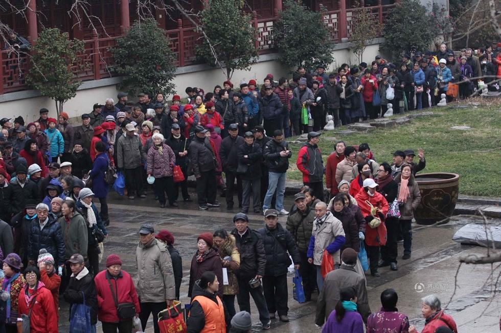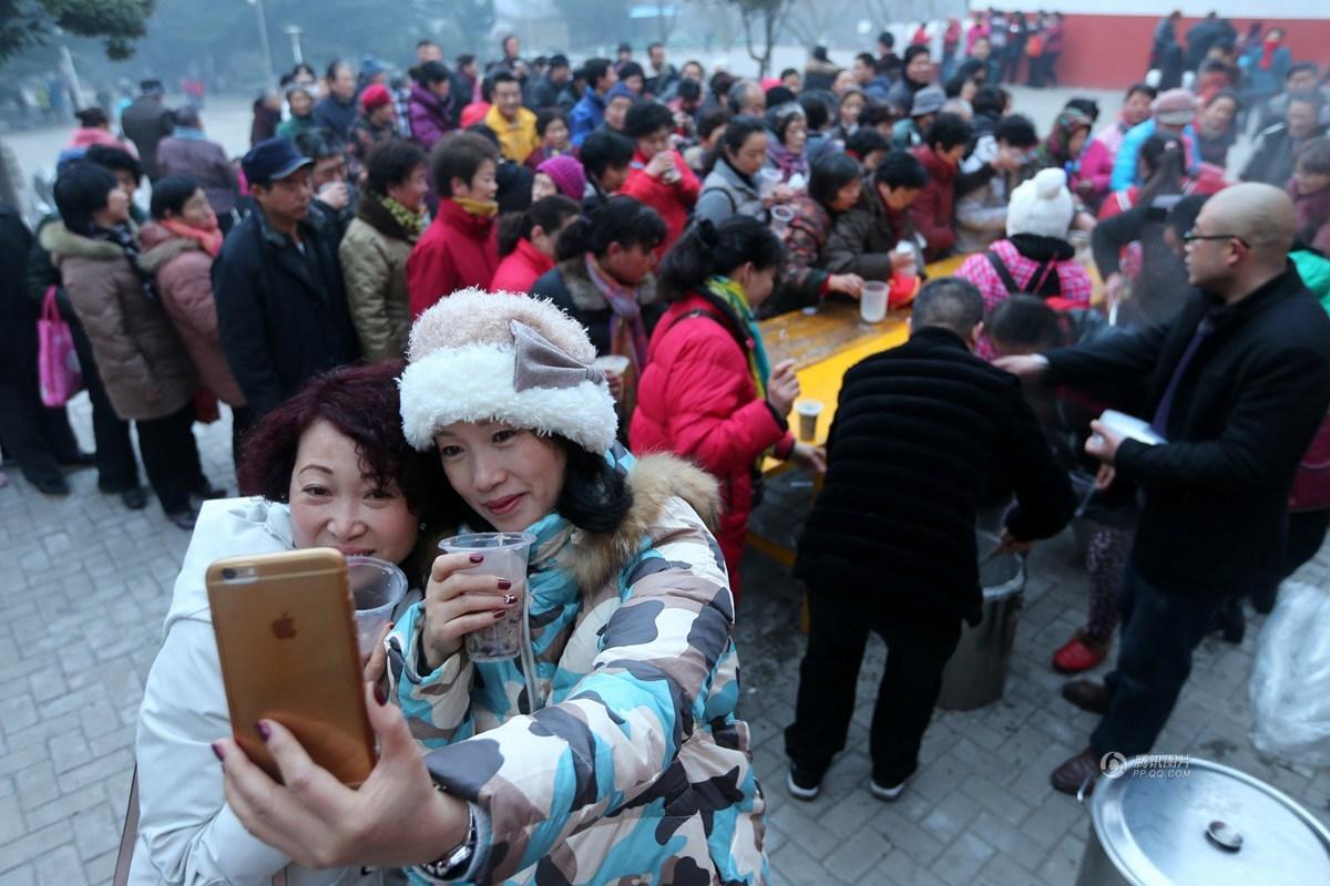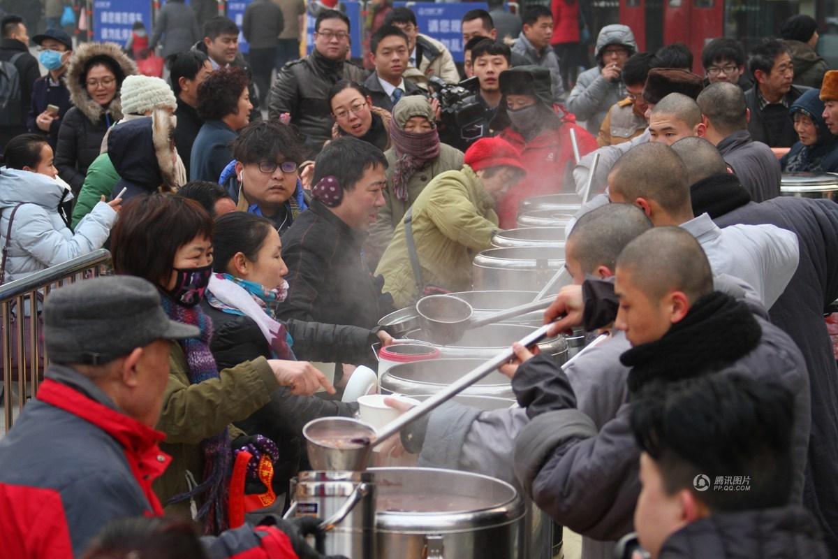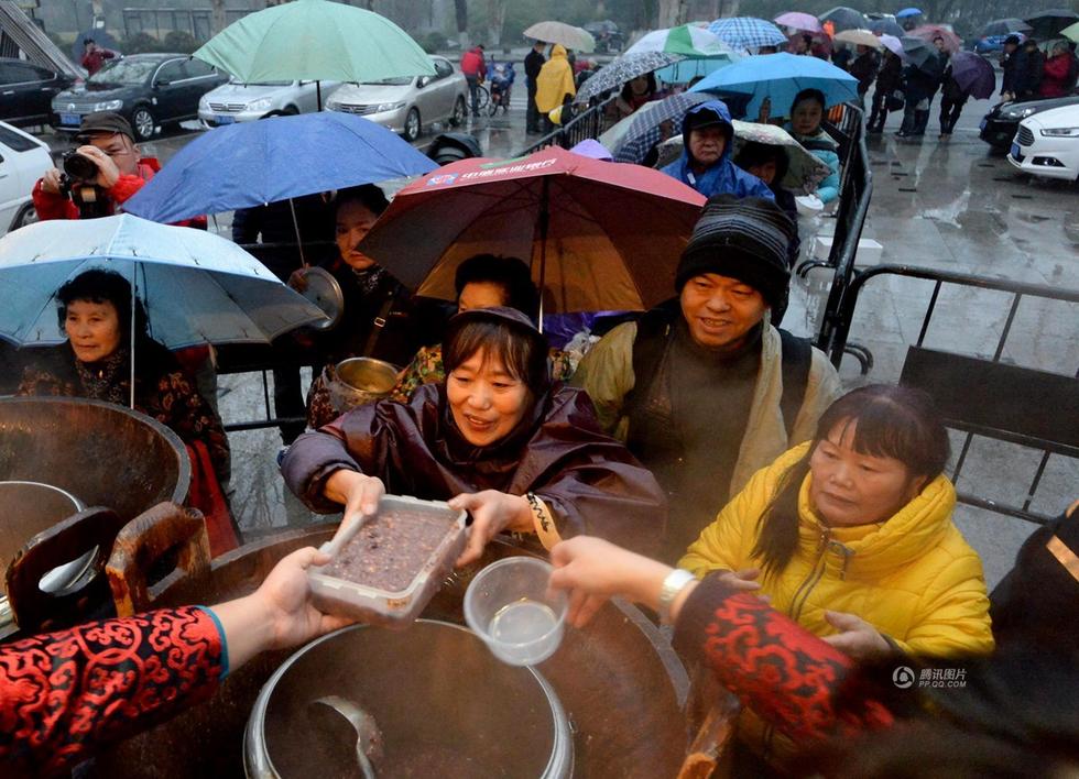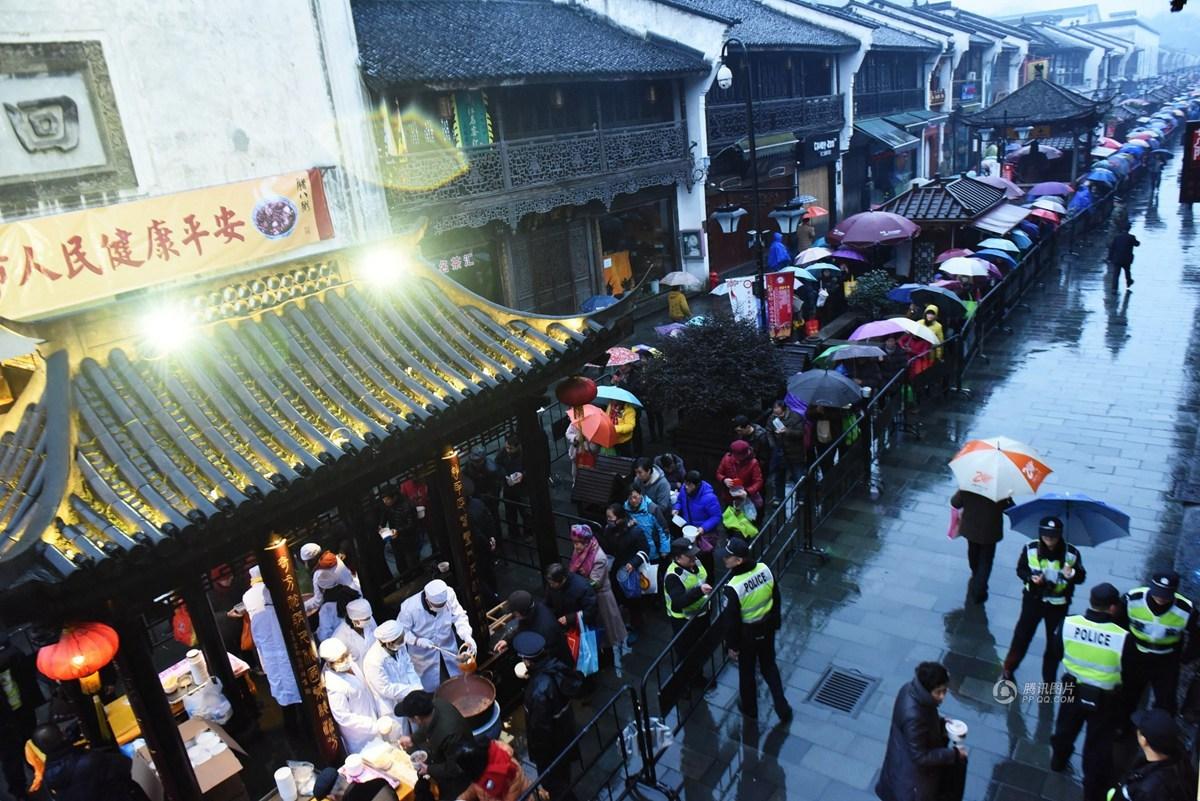 浙江省杭州市,市民在杭州河坊街上排队领腊八粥。龙巍/东方IC