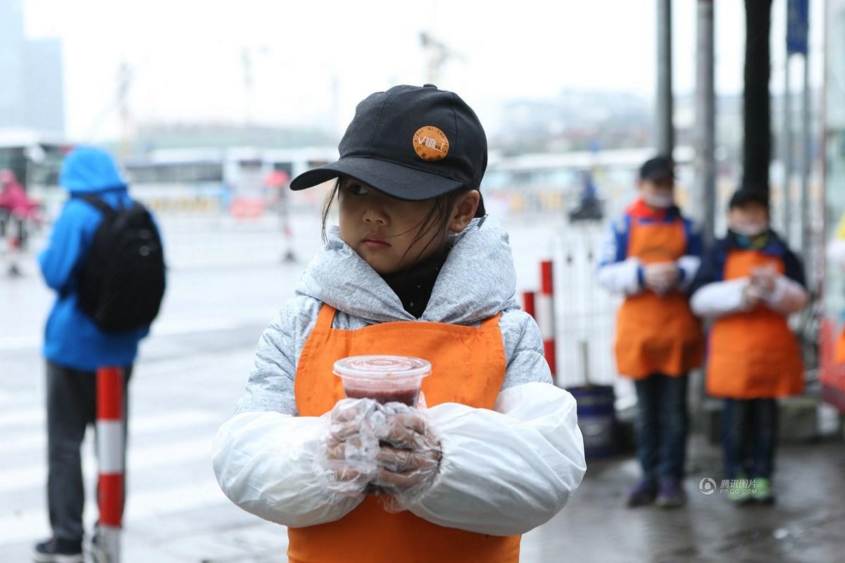 在上海闵行都市路莘朱路路口一群志愿者向来往行人赠送腊八粥。他们是来自“仁爱心栈”的志愿者。当天,39位志愿者参加,赠送出527杯粥。王亚东/东方IC |