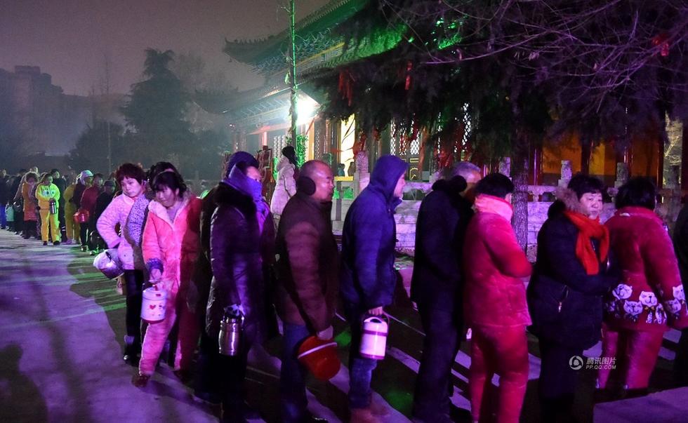 安徽省亳州市白依律院放粥点,市民在排队领取腊八粥,队伍中不少人提着桶和锅。刘勤利/视觉中国