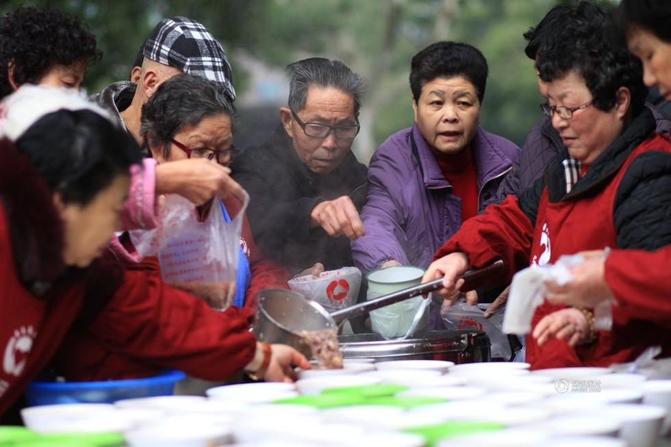 合肥,早晨6点多钟,大蜀山脚下的开福寺热气腾腾,一片热闹。数十名志愿者,四个粥桶,向市民免费施粥。视觉中国