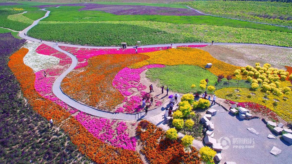 2016年5月16日,北京,十三陵水库旁,大片花海正值花期,吸引了不少市民游客。从空中航拍,画面壮美。