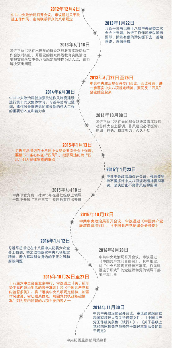 2016年11月29日,甘肃省纪委通报4起违反中央八项规定精神问题;11月28日上海市通报5起违反中央八项规定精神问题;9月28日,国务院国资委通报6起违反中央八项规定精神问题;9月27日,中央纪委通报6起违反中央八项规定精神问题……