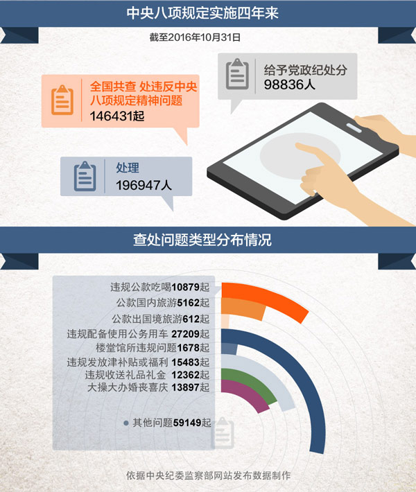 2016年11月27日,中央纪委监察部网站公布2016年10月全国查处违反中央八项规定精神问题3320起。在这个十月,又有4500多名党员干部因违反中央八项规定精神受到处理,其中95人为地厅级、542人为县处级……