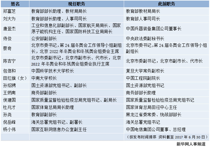 新华网北京7月8日电(记者李志强 陈淑君)6月,人事调整密集,国务院两部门“一把手”调整,五省区市完成省级党委换届,十五省份公布出席党的十九大代表名单。