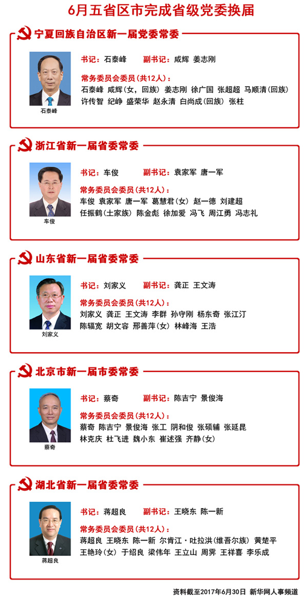 6月,宁夏、浙江、山东、北京和湖北相继召开党代会,选举产生新一届省级党委。至此,始于2016年的新一轮全国省级党委换届全部结束。本轮换届共选举产生省级党委领导班子成员375人次,其中新晋省级常委85人。