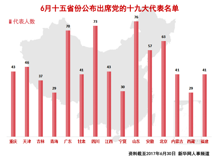 6月,重庆、天津、吉林、青海、广东、甘肃、四川、江西、宁夏、山东、安徽、北京、内蒙古、西藏和福建等十五省份公布了本省区市出席党的十九大代表名单。