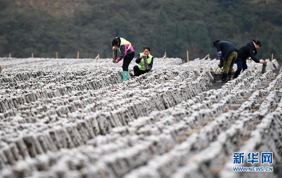 2月21日,工作人员在广西柳州市三江侗族自治县同乐苗族乡归亚村木耳基地采摘木耳。新华社发(黎寒池 摄)