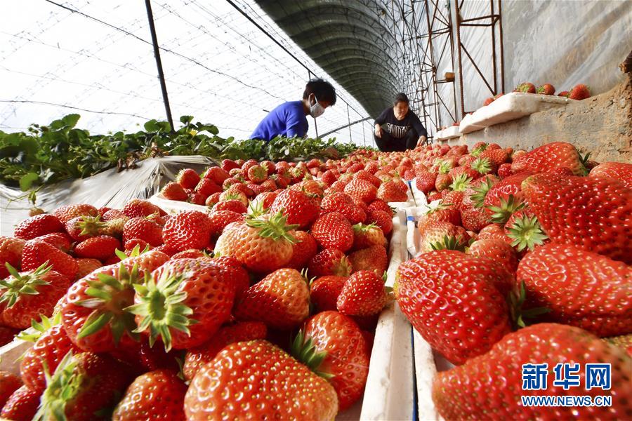 2月22日,河北省滦州市小马庄镇西晒甲坨村一家合作社的社员将采摘的草莓装箱。 新华社发(董军 摄)