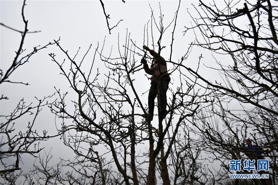 2月22日,在贵州省黔东南苗族侗族自治州锦屏县敦寨镇龙池万亩果场,村民在给果树修枝。 新华社发(彭泽良 摄)