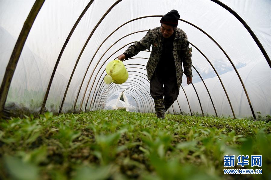 2月22日,在贵州省黔东南苗族侗族自治州榕江县平江镇,农民在大棚里为秧苗浇水。 新华社发(刘进银 摄) |