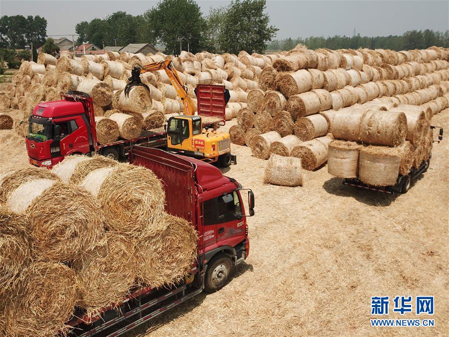6月2日,在江苏省宿迁市泗洪县龙集镇,村民在打包秸秆,待统一销售到生物质发电厂、奶牛养殖场和食用菌生产企业等地。 新华社发(许昌亮 摄)