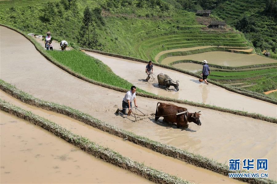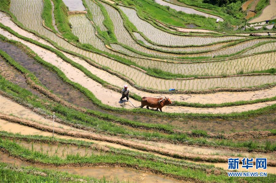 6月2日,在贵州省黔东南苗族侗族自治州榕江县八开镇党央村,村民在田间劳作。 新华社发(李长华 摄)