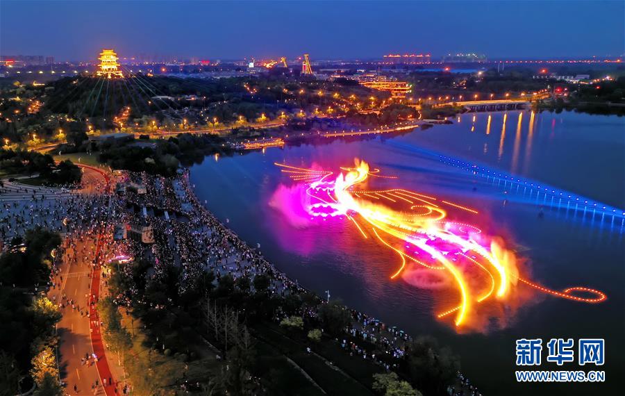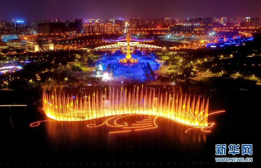 7月10日无人机拍摄的唐山南湖景区灯光水舞秀。