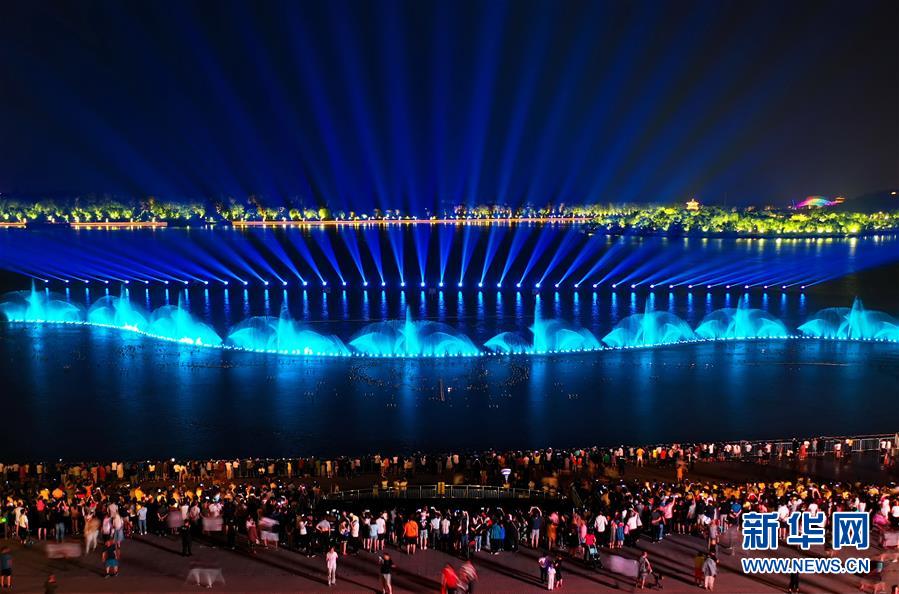 7月10日,观众在唐山南湖景区欣赏灯光水舞秀(无人机拍摄)。 |