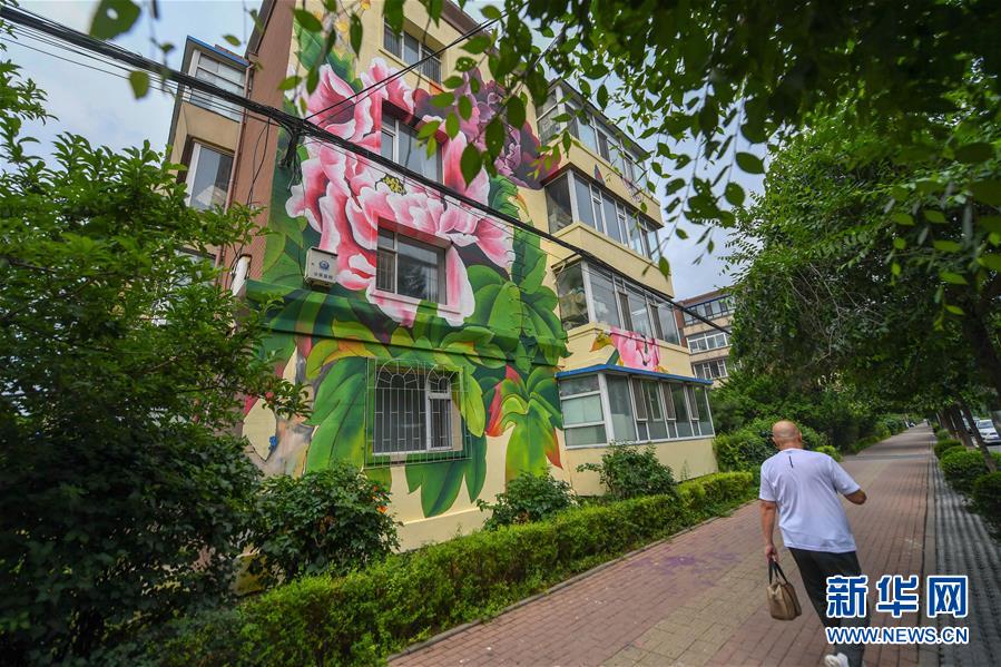 图为长春市南湖中街旁,一幢画有楼体彩绘的居民楼(7月13日摄)。
