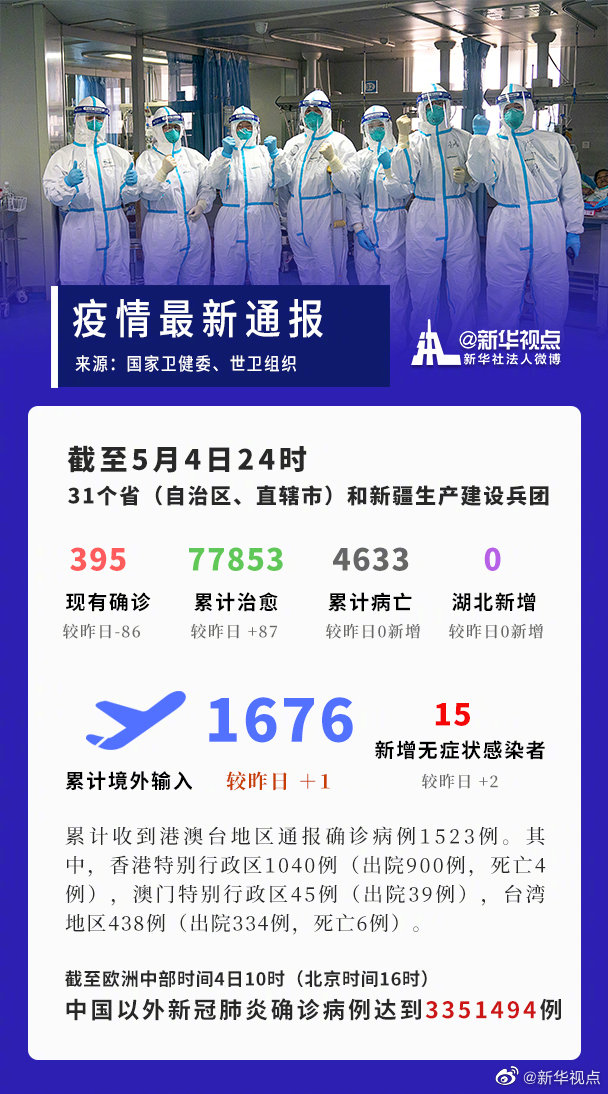 截至5月4日24时,据31个省(自治区、直辖市)和新疆生产建设兵团报告,现有确诊病例395例(其中重症病例29例),累计治愈出院病例77853例,累计死亡病例4633例,累计报告确诊病例82881例,现有疑似病例2例。累计追踪到密切接触者735240人,尚在医学观察的密切接触者7152人。
