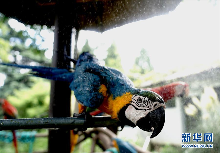 8月11日,上海动物园的金刚鹦鹉在享受喷淋降温。