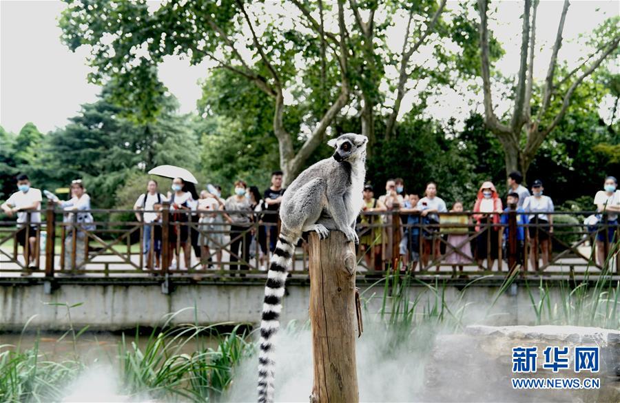 8月11日,上海动物园的环尾狐猴在“地喷”营造的水雾中玩耍。