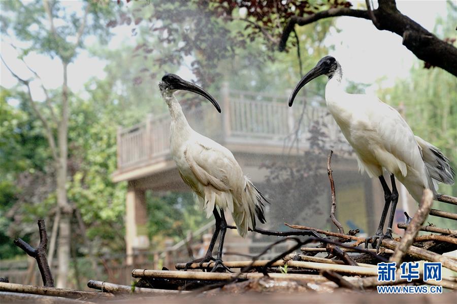 8月11日,上海动物园的两只白鹮在享受喷淋降温。