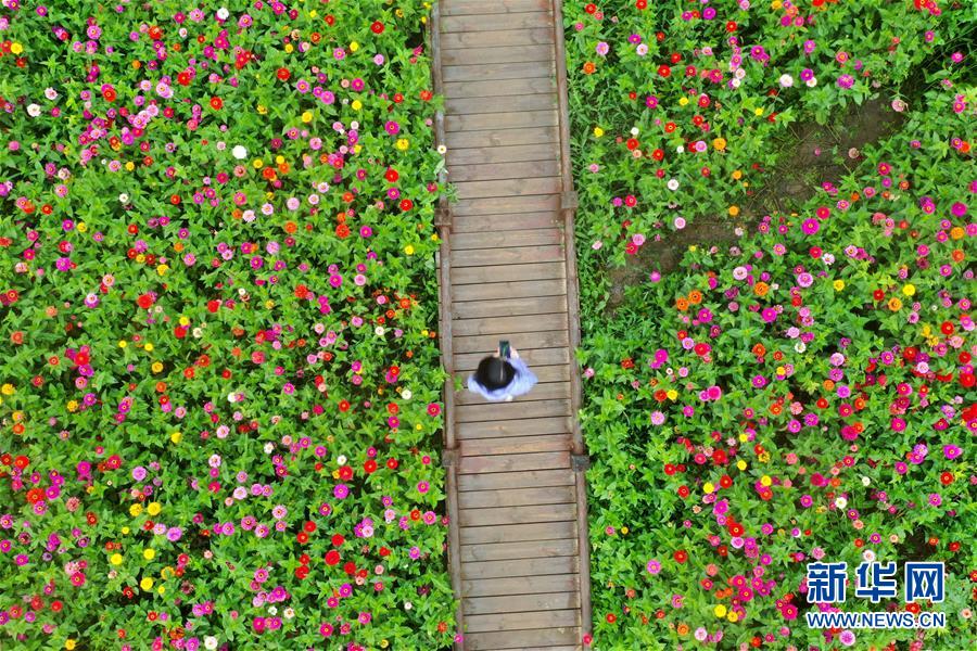 8月21日,游客在河南省洛阳市栾川县三川镇大红村观赏百日草花海(无人机照片)。
