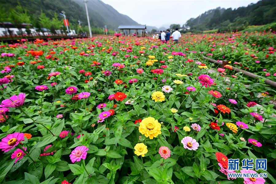 8月21日,游客在河南省洛阳市栾川县三川镇大红村观赏百日草花海。