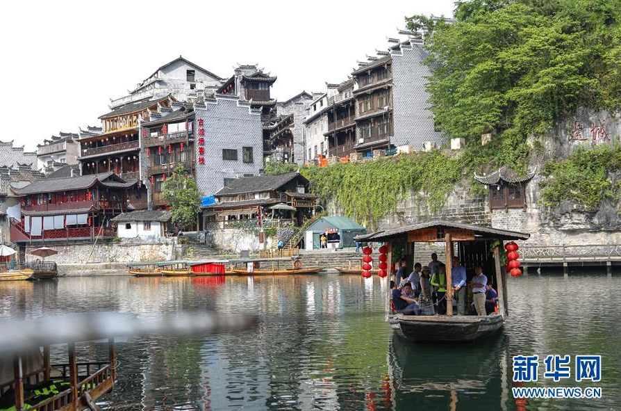 游客在洪安古镇旁乘船游览。新华社发(黄伟摄)