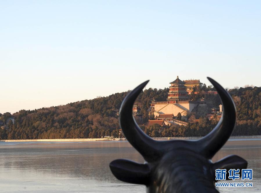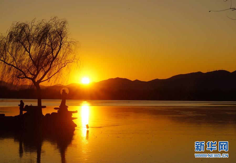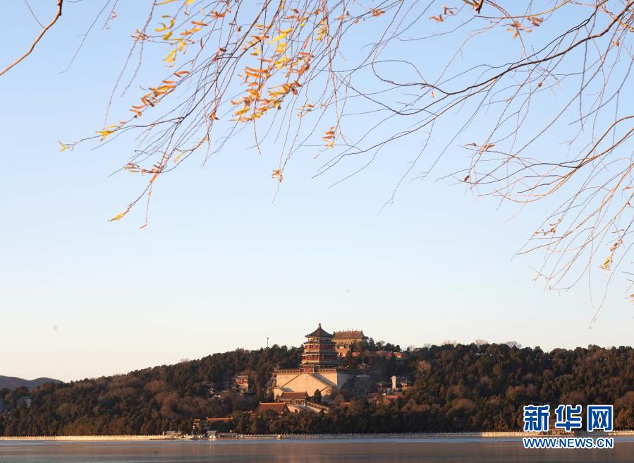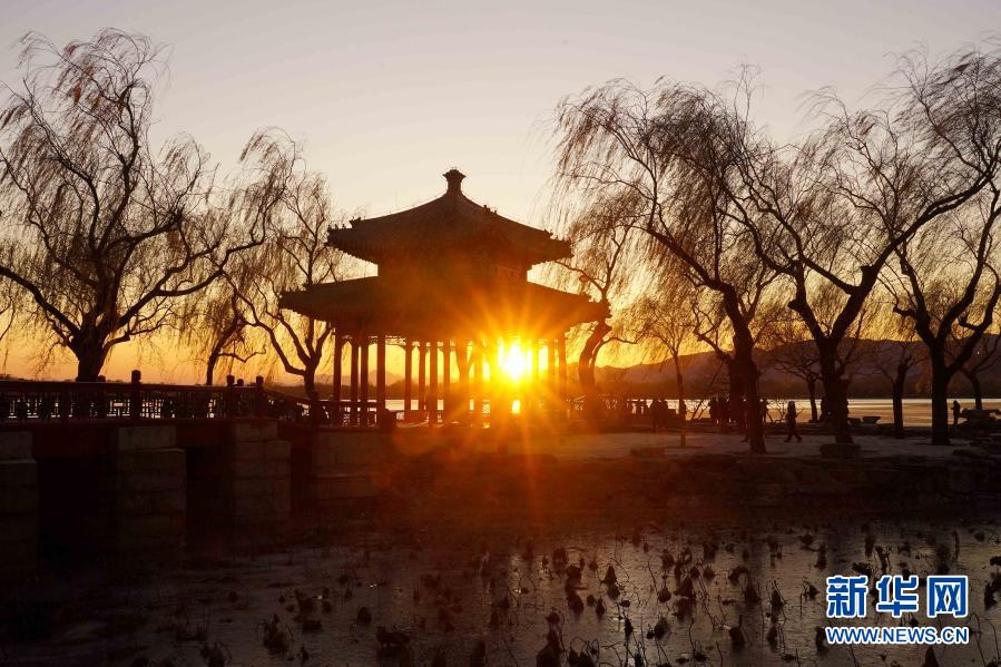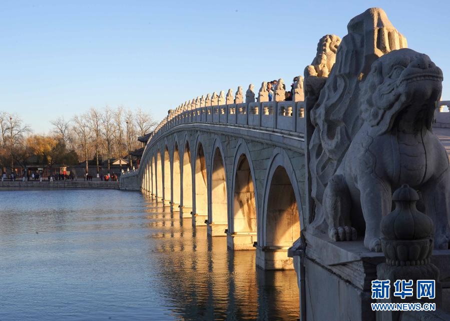 这是12月4日拍摄的颐和园十七孔桥“金光穿洞”。近日北京天气良好,落日时分的颐和园格外美丽,吸引游人观赏美景。新华社记者 陈建力 摄