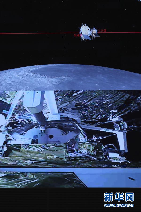这是12月6日在北京航天飞行控制中心指挥大厅拍摄的嫦娥五号上升器与轨道器返回器组合体交会对接画面。 新华社记者 金立旺 摄