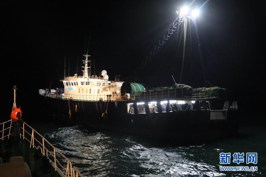 被海警执法员发现的走私集团的供油母船(12月13日摄)。新华社发(敖玉洪 摄)