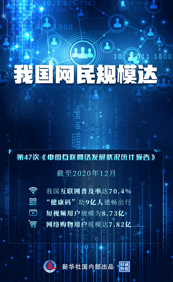 新华社北京2月3日电(记者余俊杰、范思翔)中国互联网络信息中心(CNNIC)3日在京发布第47次《中国互联网络发展状况统计报告》。报告显示,截至2020年12月,我国网民规模达9.89亿,较2020年3月增长8540万,互联网普及率达70.4%;在我国网民群体中,学生最多,占比为21.0%。