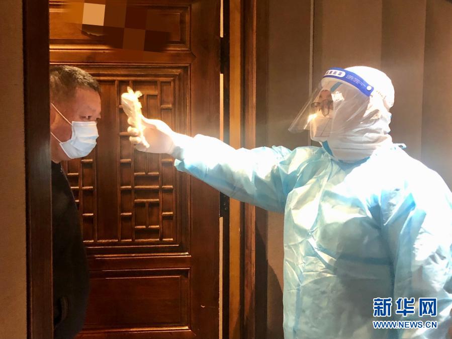 2月13日,黑龙江省哈尔滨市道外区巨源镇卫生院医生王立夫在隔离点为隔离人员测温。新华社发