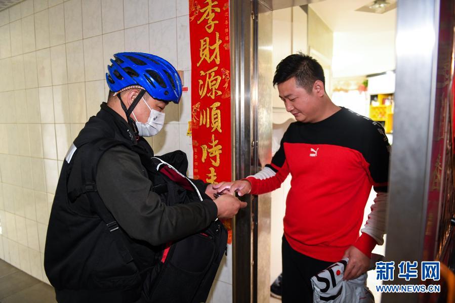 在深圳福田区一小区,顺丰速运深圳区福星营业部收派员聂华辰(左)为客户派送快件(2月10日摄)。新华社记者 毛思倩 摄
