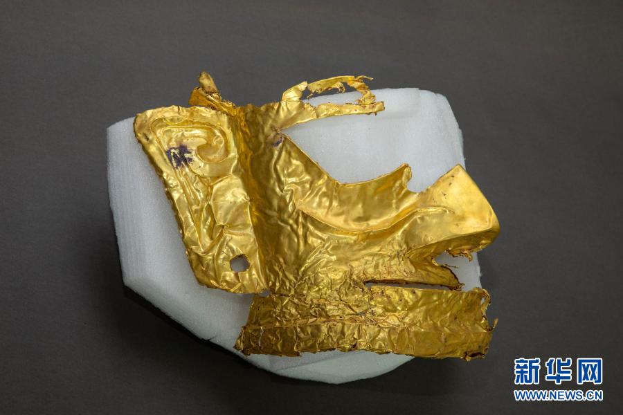 这是三星堆遗址考古发掘现场5号“祭祀坑”出土的残缺的金面具(3月17日摄)。新华社记者 沈伯韩 摄 |