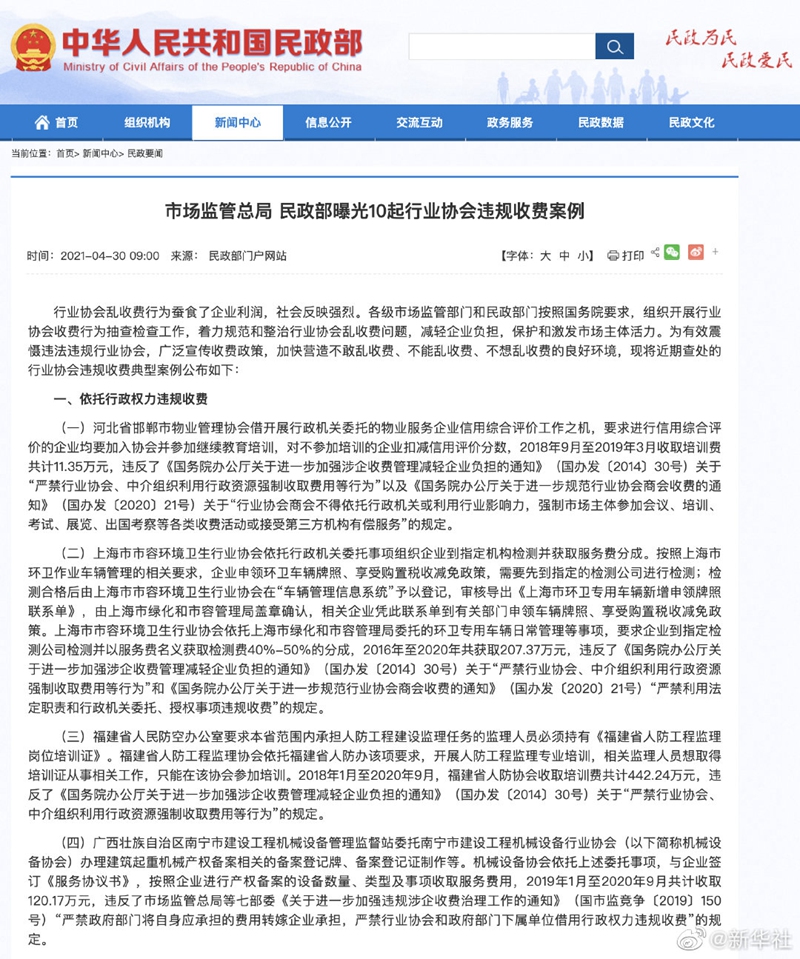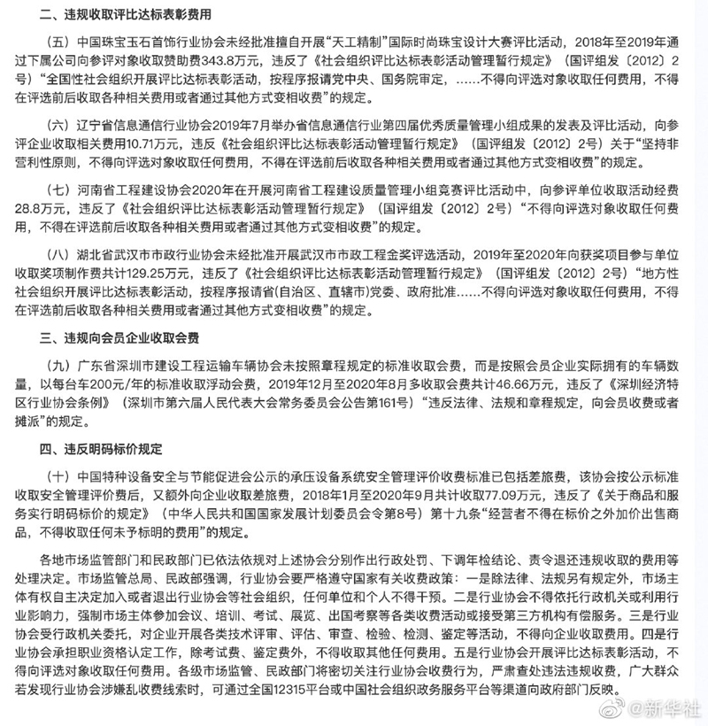 依托行政权力违规收费、违规收取评比达标表彰费用、违规向会员企业收取会费、违反明码标价规定……市场监管总局、民政部30日曝光10起行业协会违规收费案例。(记者赵文君、高蕾)