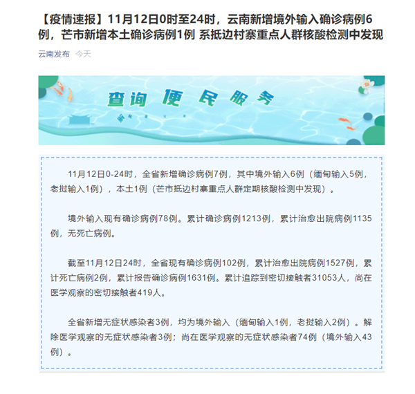 11月12日0-24时,全省新增确诊病例7例,其中境外输入6例(缅甸输入5例,老挝输入1例),本土1例(芒市抵边村寨重点人群定期核酸检测中发现)。