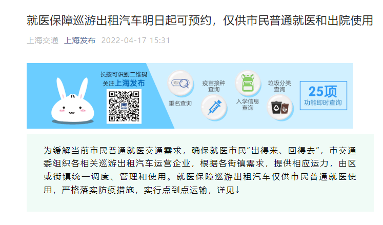 为缓解当前市民普通就医交通需求,确保就医市民“出得来、回得去”,市交通委组织各相关巡游出租汽车运营企业,根据各街镇需求,提供相应运力,由区或街镇统一调度、管理和使用。就医保障巡游出租汽车仅供市民普通就医使用,严格落实防疫措施,实行点到点运输。