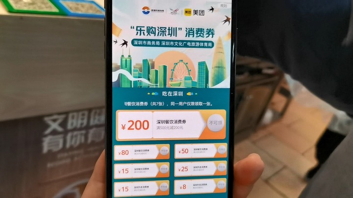 深圳自“五一”起,通过美团、京东等平台陆续发放5亿元消费券,涉及购物、餐饮、文体旅游、数字人民币红包等方面。(美团 供图)