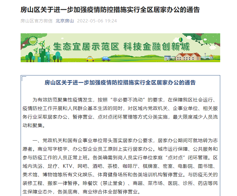 房山区关于进一步加强疫情防控措施实行全区居家办公的通告