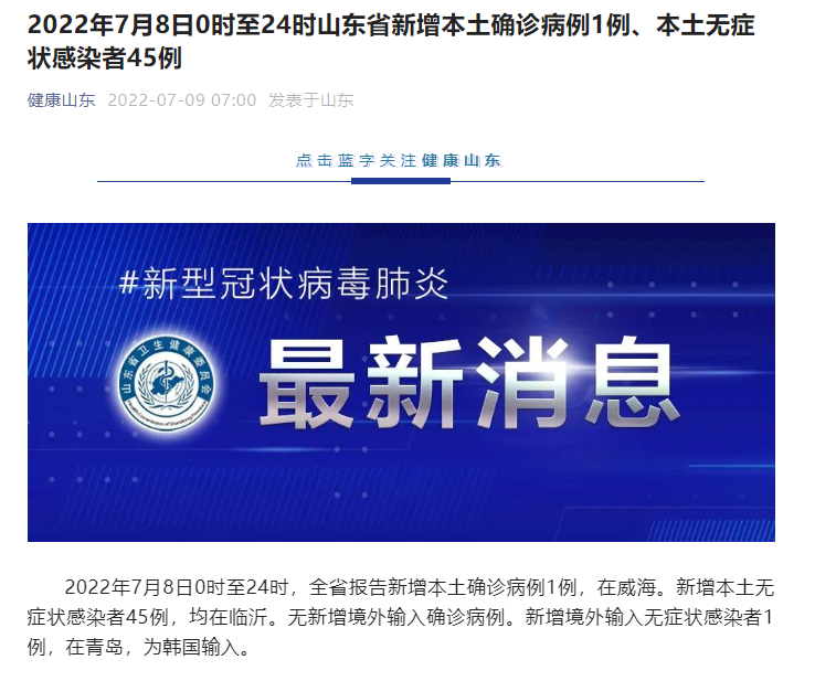 2022年7月8日0时至24时,山东省报告新增本土确诊病例1例,在威海。新增本土无症状感染者45例,均在临沂。无新增境外输入确诊病例。新增境外输入无症状感染者1例,在青岛,为韩国输入。
