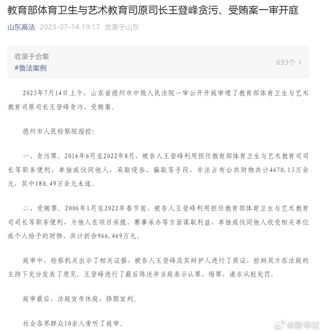 2023年7月14日上午,山东省德州市中级人民法院一审公开开庭审理了教育部体育卫生与艺术教育司原司长王登峰贪污、受贿案。