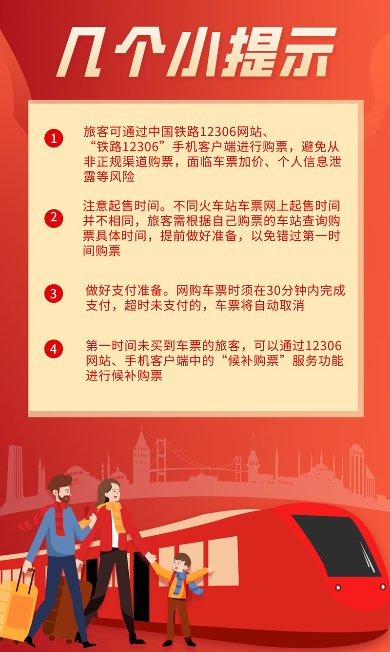 首先,旅客可通过中国铁路12306网站、“铁路12306”手机客户端进行购票,避免从非正规渠道购票,面临车票加价、个人信息泄露等风险。