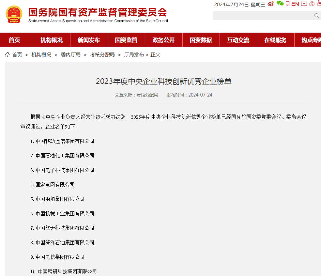 国务院国资委7月24日发布了2023年度中央企业科技创新优秀企业榜单,中国移动通信集团有限公司、中国石油化工集团有限公司、中国电子科技集团有限公司等26家中央企业上榜。这是国务院国资委首次设立年度科技创新优秀企业榜单。