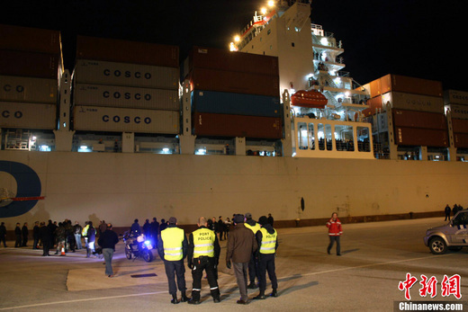 当地时间2月28日夜,中国远洋运输集团6.9万吨级的远洋集装箱货轮“天福河号”接运559名在利比亚的中国公民抵达希腊克里特岛伊拉克里翁港码头。这是中国大型货轮首次接运在利比亚的中国公民抵达希腊。中新社发 吴卫中 摄