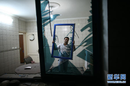 8月19日,新华社雇员正在查看办公室受损情况。为报复以色列南部系列袭击事件,以色列军队18日和19日凌晨向加沙地带多处发动空袭,造成至少6人死亡。位于哈马斯安全据点附近的新华社加沙分社办公室受到波及,外墙玻璃破碎,门窗脱落,所幸未造成人员伤亡。