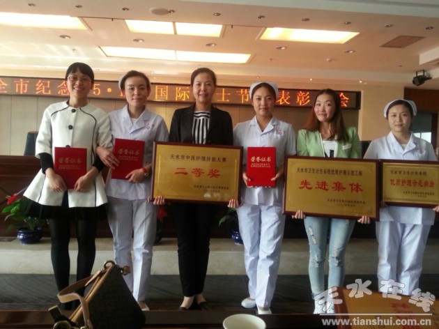 在全市中医护理技能大赛上,由天水市三院护理部主任雷志洁带队,田蕊丽、罗芳弟、王霞3人组成的市第三院代表队,以良好的职业风范、娴熟的技能手法、人性化的专业服务、敏捷的应变能力,一举夺得刮痧项目一等奖、拔火罐项目二等奖以及团体二等奖的好成绩。
