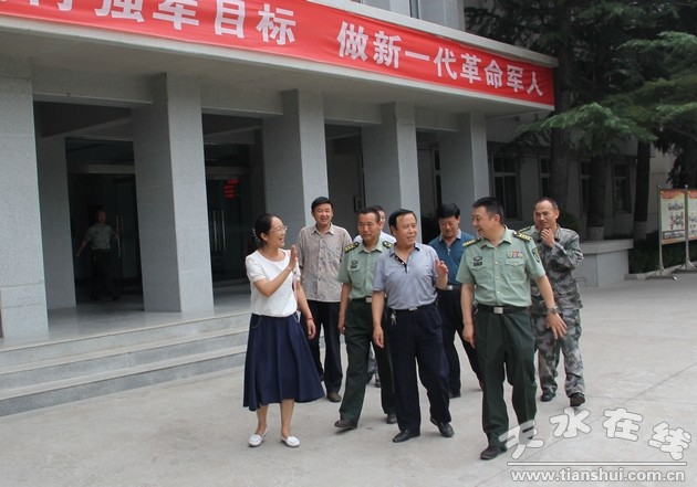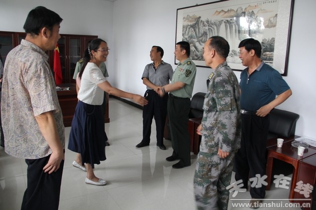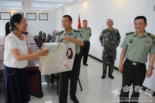 在中国人民解放军建军88周年来临之际,7月29日,天水市卫生监督所所长张春英、党支部书记周致军带领领导班子成员及相关人员,走访慰问了天水预备役步兵旅,受到部队官兵的热烈欢迎。