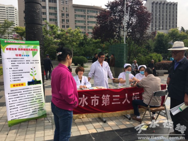 为了迎接第29个“世界无烟日”,进一步普及烟草危害知识,宣传烟草带来的危害,提高群众对控烟工作的认识,引导公众主动参与到戒烟控烟活动中来,市三院由副院长李刚带队,派出7名医护人员,在龙城广场开展了控烟宣传和义诊活动。