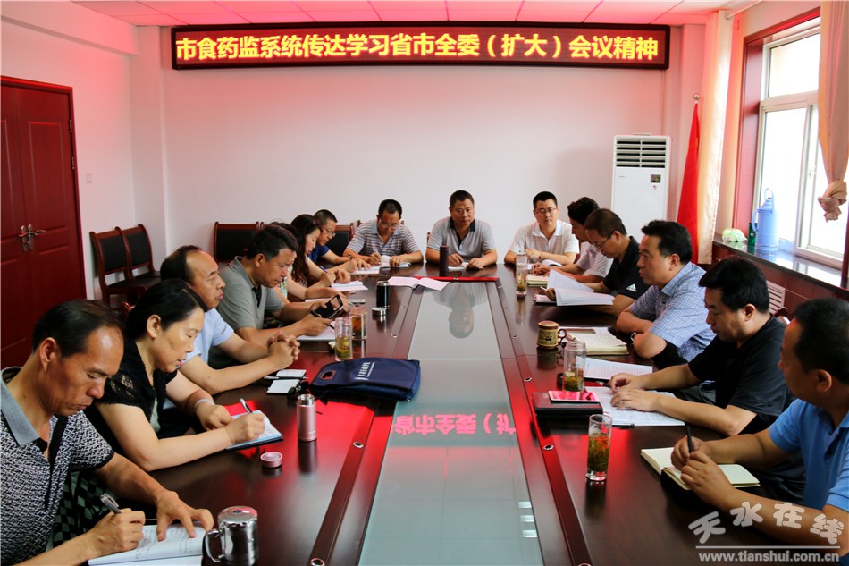 8月16日上午,天水市食药监局党委书记、局长陈克孝同志主持召开会议,专题传达学习省委十二届十七次全委(扩大)会议和市委六届十三次全委(扩大)会议精神。市局领导班子成员、各直属单位负责人和机关各科室负责人共计20余人参加了会议。